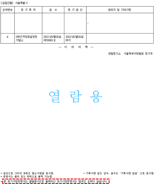 마지막 페이지 하단에는 열람용이므로 법적인 효력이 없다는 문구가 표시됩니다. 열람하시는 분들께서는 꼭 명심하시기 바랍니다.