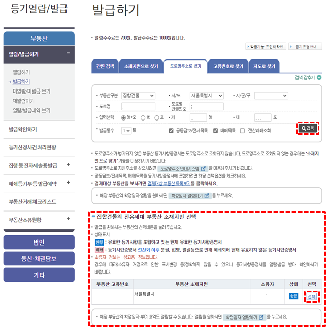 정보를 모두 작성하고 검색을 클릭하시면 하단에 집합건물의 전유 세대 부동산 소재 지번을 선택하라고 나옵니다. 부동산 소재 지번과 소유자 성을 확인한 후 선택을 누릅니다.