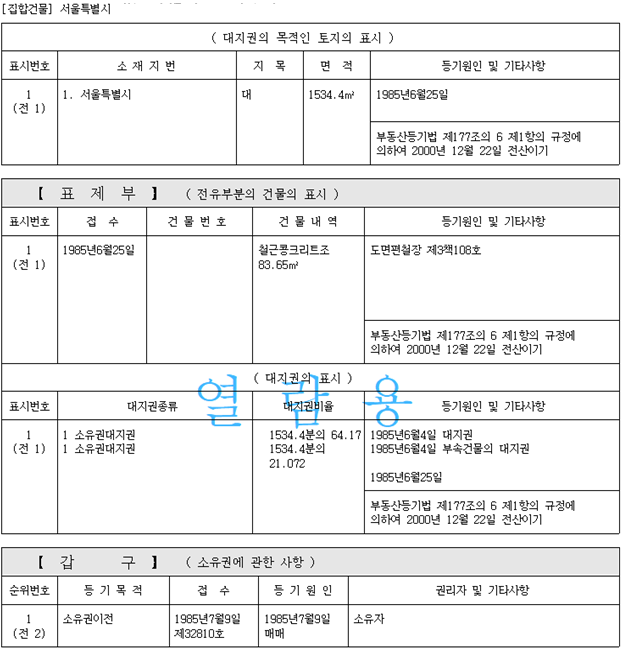 첫 페이지에는 표제부 중 1동 전체에 대한 건물의 표시인 표시번호, 접수, 소재번호 및 건물명칭, 건물내역, 등기원인 및 기타사항이 나옵니다.