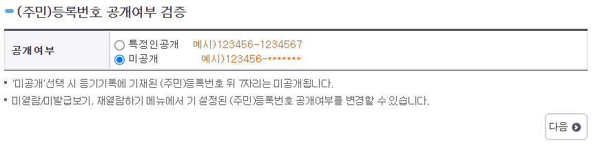 주민등록번호 공개 여부를 선택하고 하단의 다음 버튼을 누릅니다.
