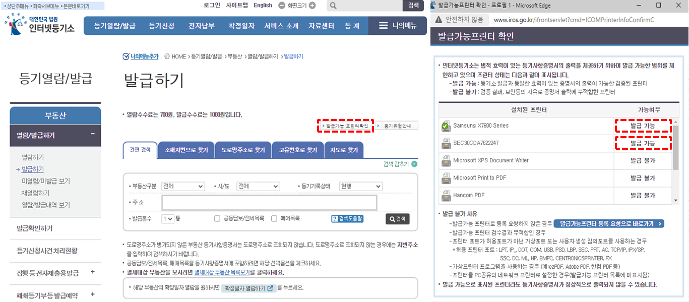 저는 회사에서 발급을 받은 관계로 "발급 가능 프린터 확인" 버튼을 누르니 가능한 프린터가 두 개 나타납니다.