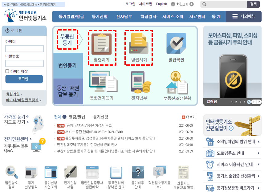 등기부등본의 열람 및 발급은 "대한민국 법원 인터넷 등기소"에서 신청할 수 있습니다.