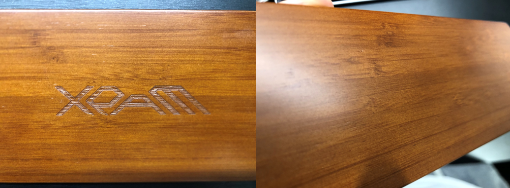 포장지에서 제품을 꺼내면 아래 사진과 같은 손목 받침대가 나옵니다. 받침대의 나무 무늬를 자세히 보면 가로로 여려 줄이 나 있는 것이 얇은 원목 여러 개를 붙여서 만든 제품인 것 같습니다. 받침대의 밑면에는 미끄럼 방지패드가 양 끝에 꽤 넓은 면적으로 붙어있고 가운데는 XPAM이라는 로고가 음각으로 새겨져 있습니다.