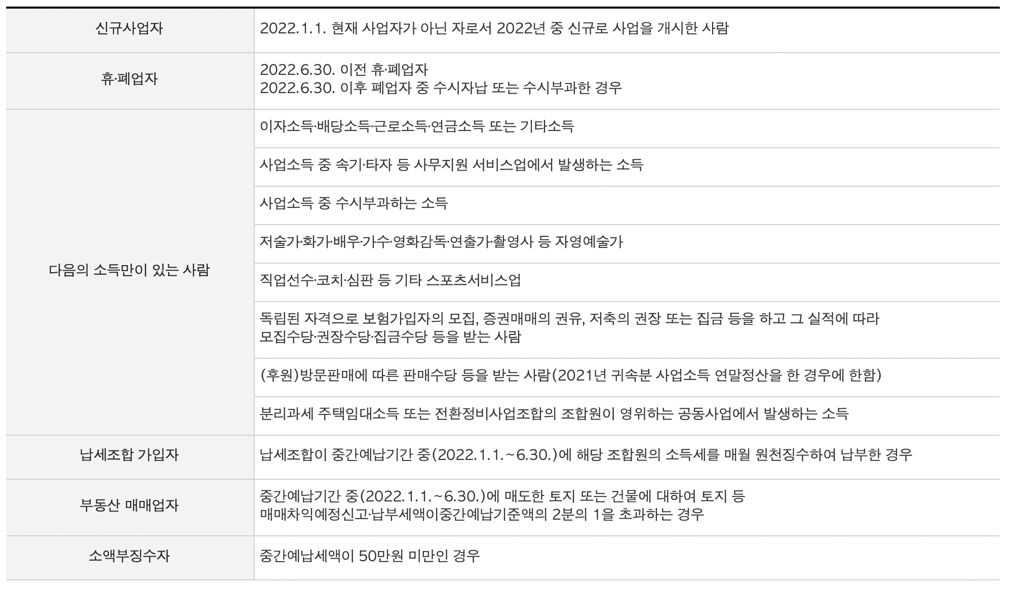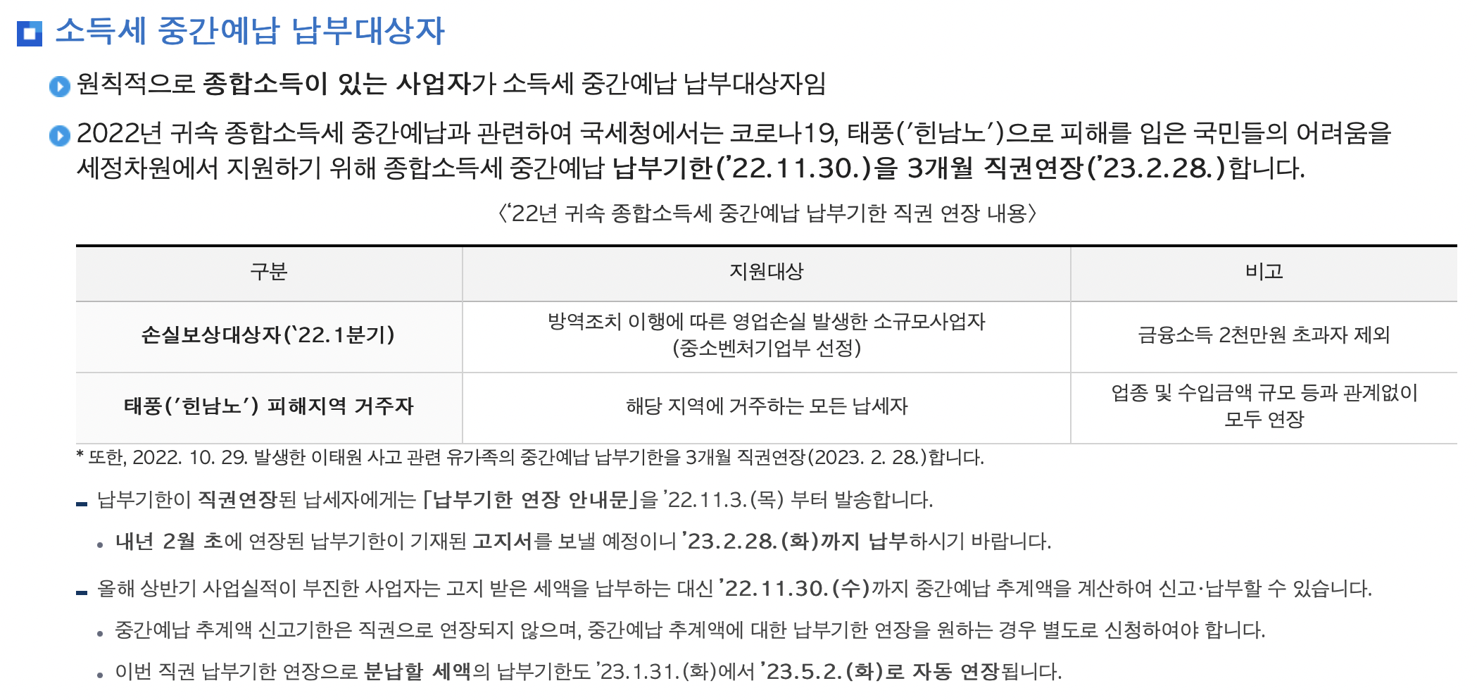 세금이라서 그런지 대상에서 제외하는 등 이런 것이 없습니다. 다만 코로나19 방역 피해로 영업손실이 발생한 사업장 및 한남노 피해, 이태원 참사 유가족에 한하여 3개월 직권 연장되고요. 상반기 실적이 부진하여 자신이 직접 계산하여 납부하고자 하시는 분들께서는 중간예납 추계액을 별도로 계산하여 신고, 납부할 수 있습니다.