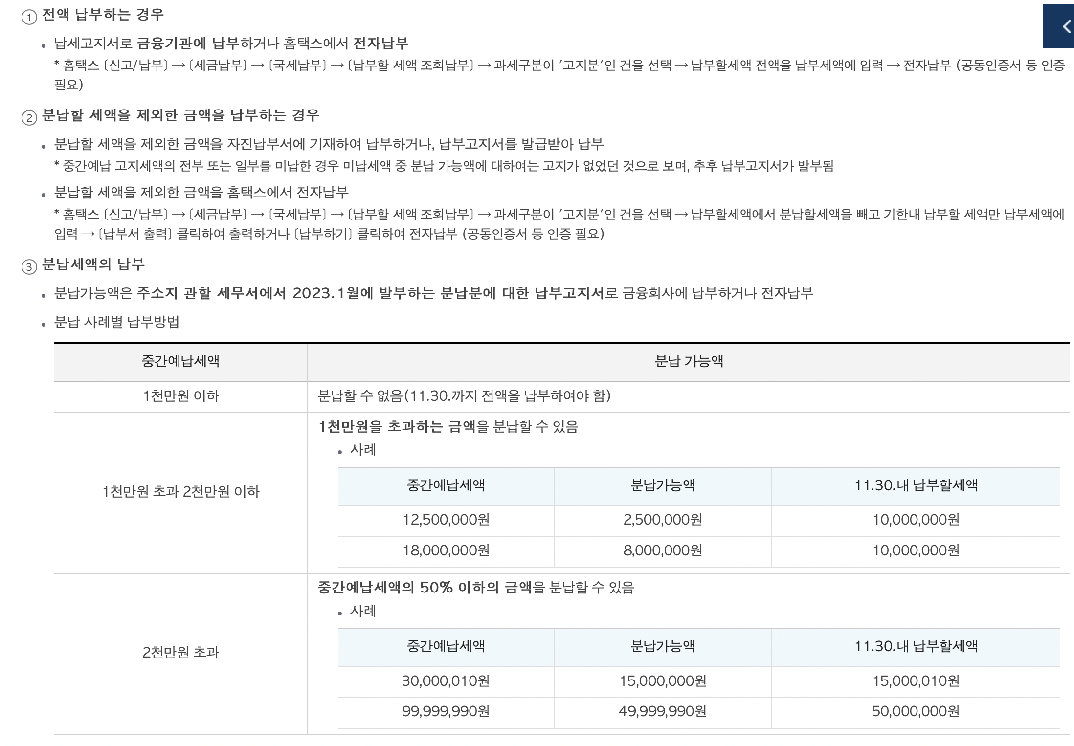 중간예납액 납부 방법 : 전액, 분납 세액 제외 납부, 분납세액 납부