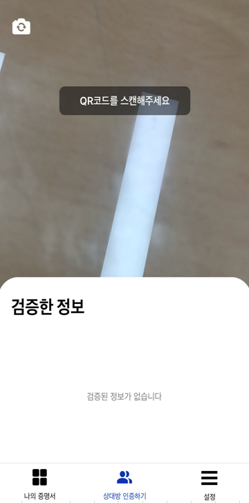 백신 접종을 확인받고자 하는 쪽은 위의 QR코드를 보여주고 확인하고자 하는 쪽은 하단의 메뉴 중 "상대방 인증하기" 버튼을 눌러 상대방의 QR코드를 스캔하면 쉽게 백신 접종 여부를 확인할 수 있습니다.