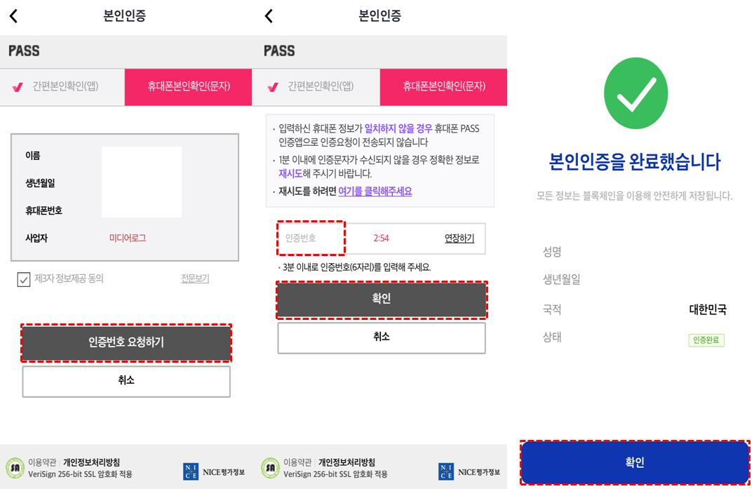 본인인증 완료 시에도 블록체인을 이용해 안전하게 저장된다는 것을 강조합니다.