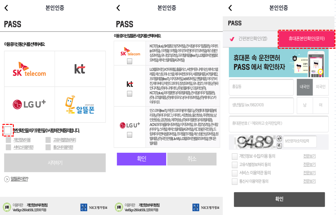본인인증을 합니다. 필자는 알뜰폰 사용자로 "문자"를 이용하여 본인인증을 하였습니다.