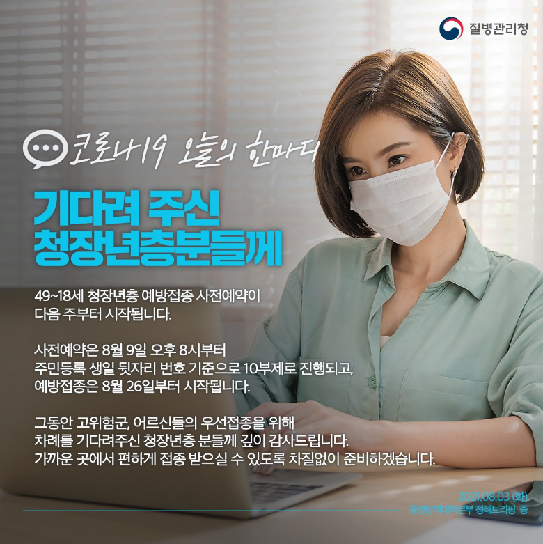 어제인 8월 3일 정례 브리핑에서 10부제 사전예약의 경우 8월 9일부터 주민등록번호 생일 뒷자리를 기준으로 10부제로 예약하고 접종은 26일부터 진행된다고 발표하였는데요. 이제까지 고위험군의 접종을 위해 기다렸던 대상자 분들께 희소식이 아닐 수 없습니다.