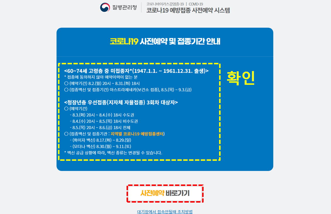 우선접종 대상자분들의 예약은 8월 3일 ~ 5일 사흘간 진행되는데요. 일자별로 수도권과 비수도권을 나누어 예약을 진행한다고 하니 날짜를 잘 확인하셔야 하겠습니다.