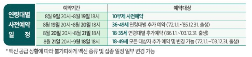 10부제 사전예약의 경우 접종은 8월 26일(목)부터 9월 30일(목)까지 약 34일에 걸쳐 진행됩니다. 18~49세의 인구가 많은 관계로 일정도 길어지게 됩니다.
