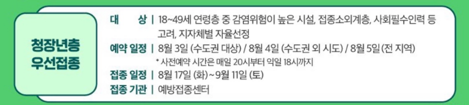 우선접종 대상자분들의 예약은 8월 3일 ~ 5일 사흘간 진행되는데요. 일자별로 수도권과 비수도권을 나누어 예약을 진행한다고 하니 날짜를 잘 확인하셔야 하겠습니다.