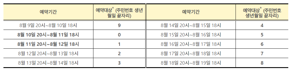 모든 예약은 20시 ~ 익일 18시가 기준이며, 위 예약 대상에 나와있는 0~9까지의 숫자는 주민등록번호 생년월 일중 가장 끝자리를 말합니다. 예를 들어 주민등록번호 앞자리가 860904이면 8월 14일 20시부터 예약이 가능합니다.