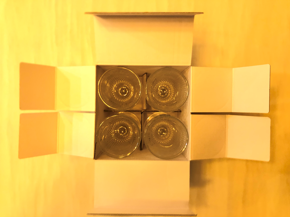박스를 열자 잔 4개가 아래 사진처럼 포장되어있습니다. 유리잔인 걸 고려했을 때 잔과 박스와의 유격이 거의 없는 게 배송 중에 파손율이 높을 것 같다는 생각도 들었지만 제가 구매한 제품엔 전혀 이상이 없었습니다.