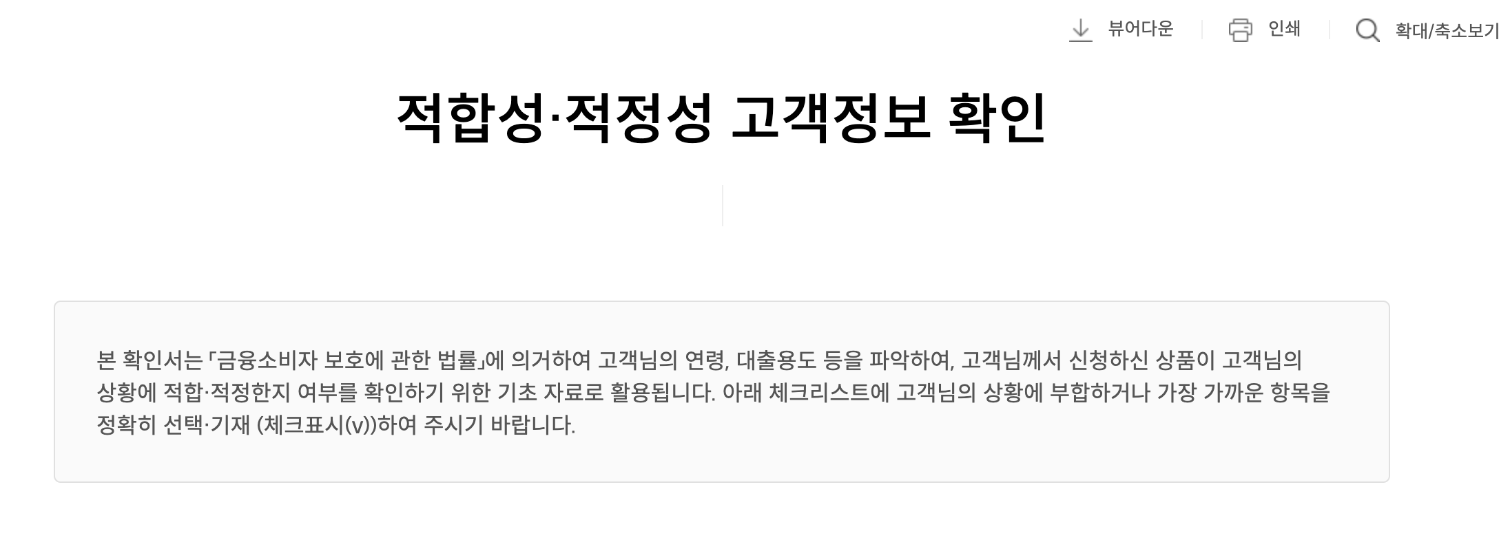 이후 적합성, 적정성 고객정보 확인이 있는데요. 본인 정보와 대출용도, 본인 자산규모, 연간소득, 부채, 고정지출, 신용, 변제방법을 선택하라고 나옵니다. 본인에게 맞는 항목 선택 후 다음을 눌러주세요.