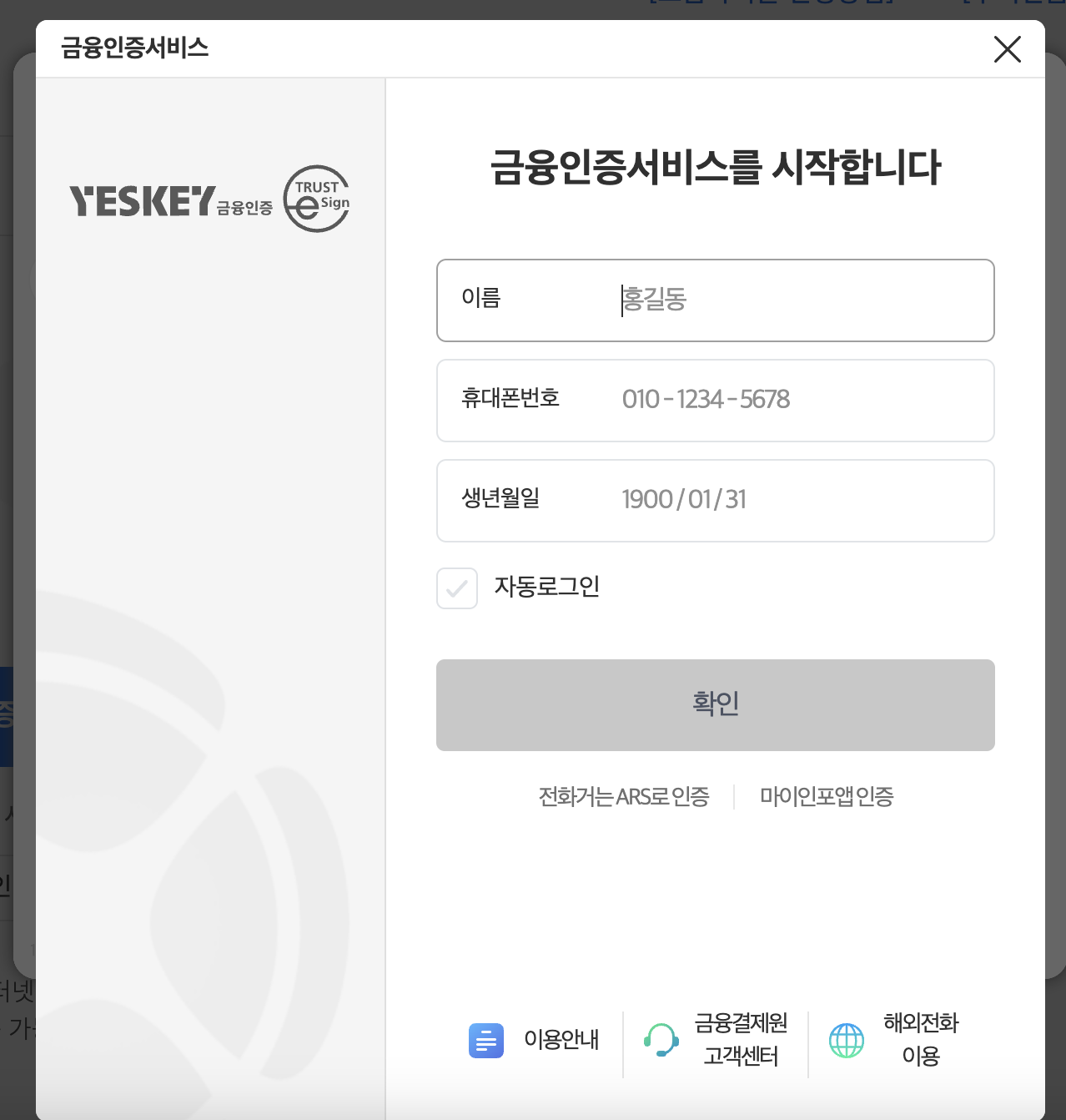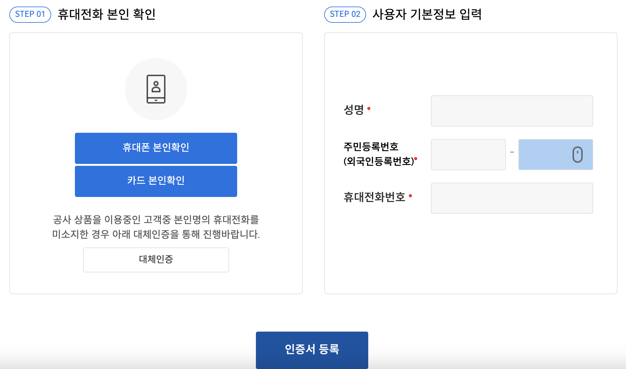 인증서 등록을 못하시는 분들이 계실것 같아 등록하는 방법도 알려드리겠습니다. 아래 좌측에 보면 휴대전화 확인과 사용자 기본정보 입력이 있죠? 휴대폰 본인확인을 누르시면 우측의 사진처럼 아주 익숙한 인증 화면이 나옵니다. 여기서 본인의 휴대폰 정보를 입력하고 본인확인을 하신 후 사용자 기본정보를 입력하시면 됩니다.
