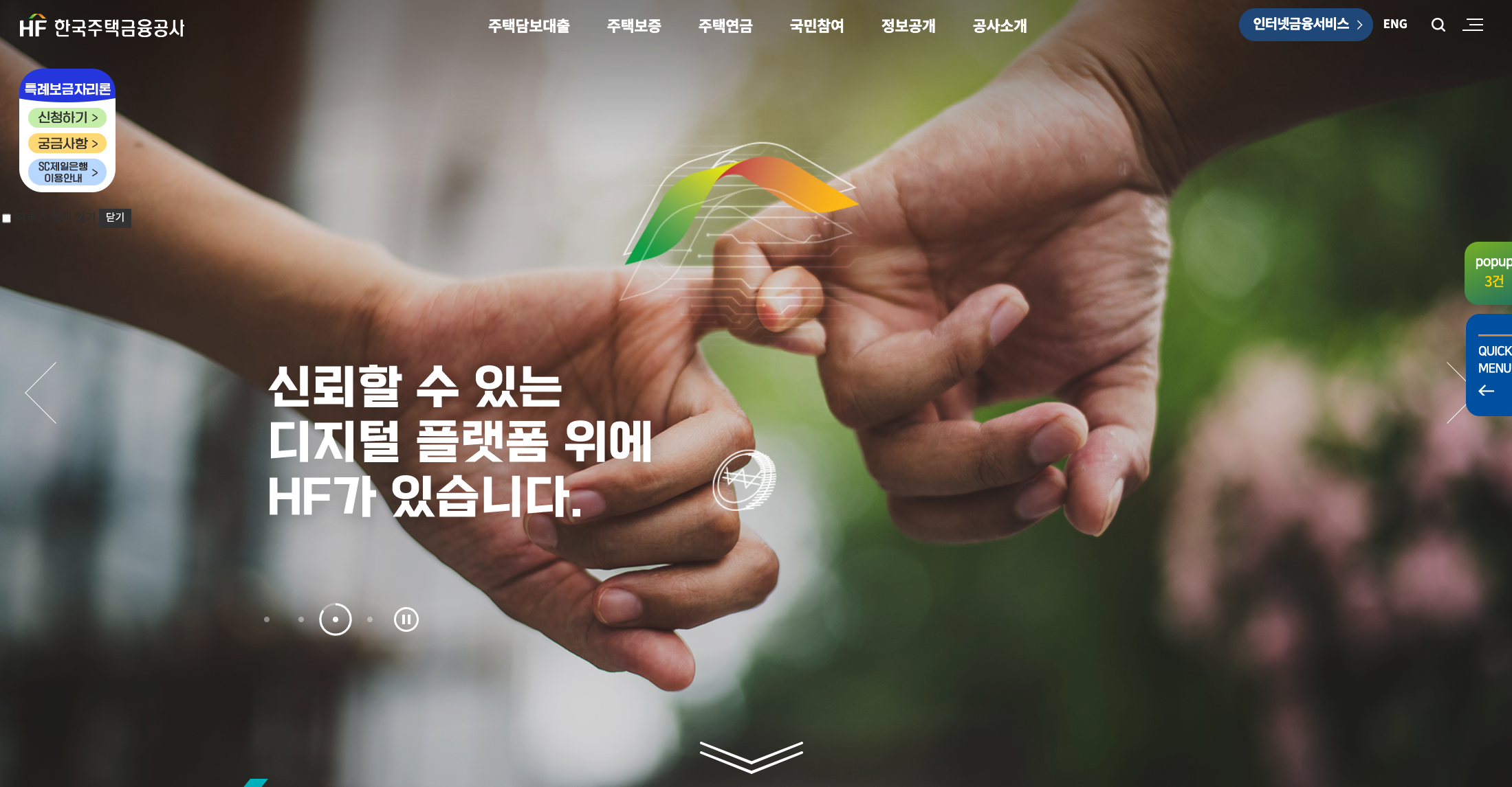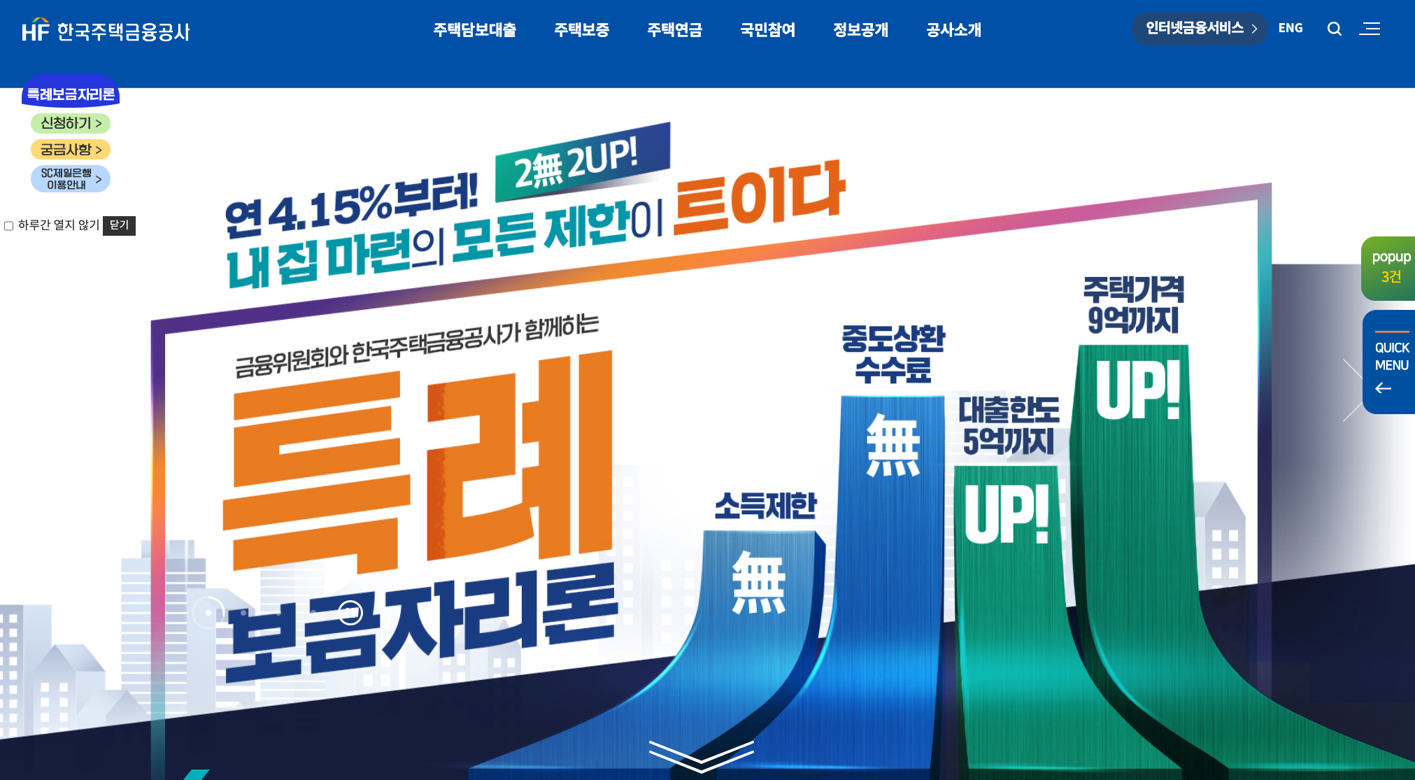 한국주택금융공사 홈페이지에 접속하면 첫 화면이 특례보금자리론인데요. 일단 홈페이지 접속하셔서 조건 및 상품 구조를 확인하신 후 신청하시길 추천드립니다.