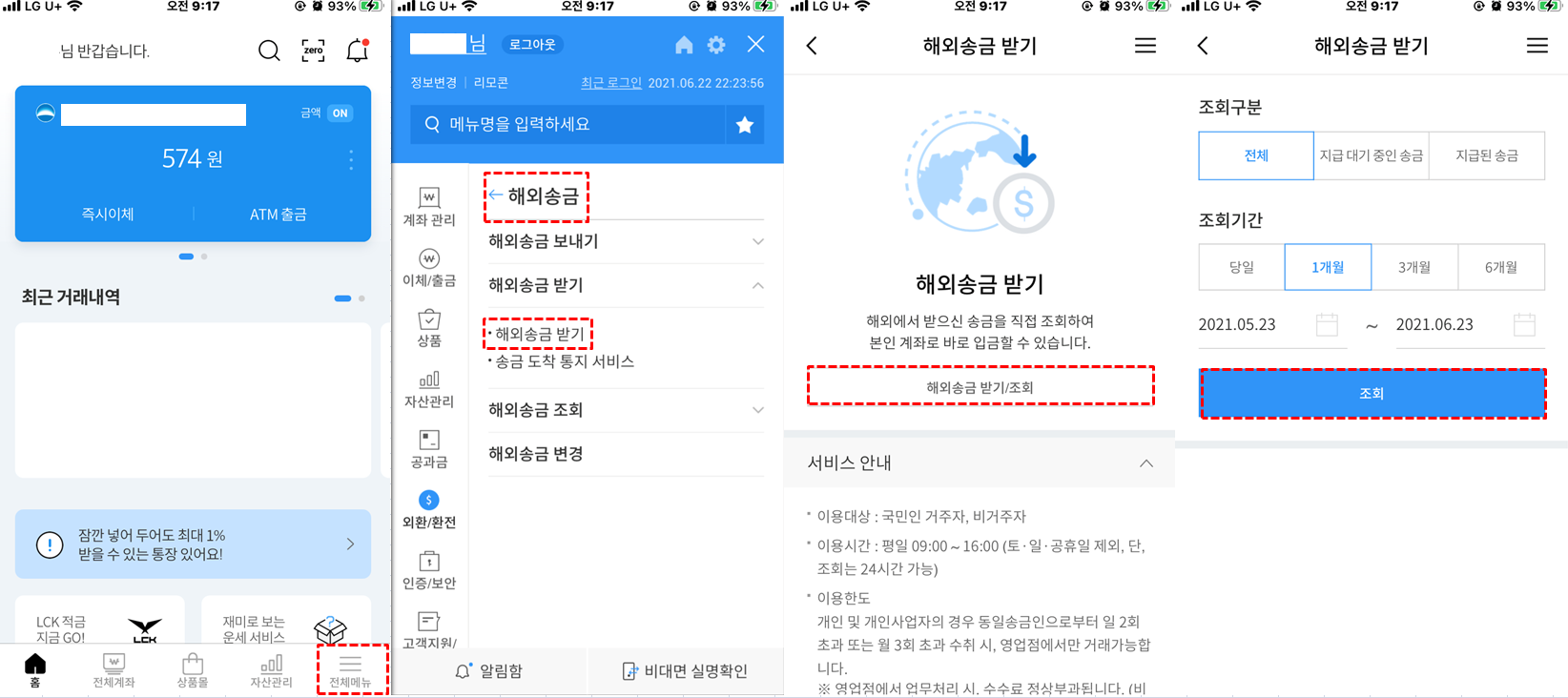 먼저 우리은행 어플에 로그인을 하고 우측 하단의 전체 메뉴를 누른 다음 외환/환전 > 해외송금 > 해외송금받기를 누르시면 됩니다. 그리도 다음 화면에서 조회를 누르시면 입금된 항목이 나옵니다.