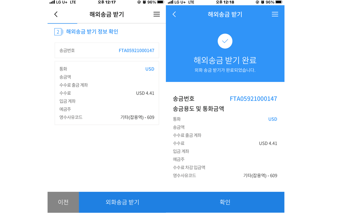 모두 다 선택하시고 다음을 누르면 정보를 확인하라고 나오고 "외화송금받기"를 누르시면 송금이 완료됩니다.