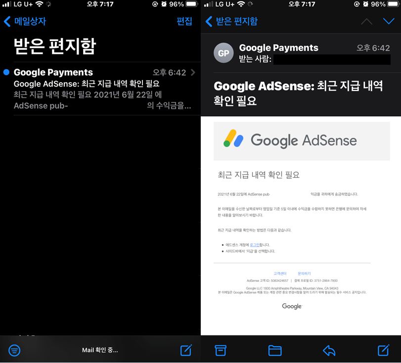 구글에서 우리은행으로 송금을 하면 동시에 확인하라는 메일이 날라 옵니다. 저의 경우에는 통장으로 입금까지 시키고 나서 그날 오후에 이메일이 왔습니다. 보통 이메일이 먼저 오고 통장에 입금을 시킨다고 하는데 약간의 시간차는 있는 것 같습니다.