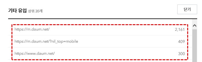 네이버 서치어드바이저와 구글 서치콘솔에 작성한 글을 수집 요청하려면RSS와 사이트맵을 등록시켜야 하는데 이 과정에서 검색엔진들이 들락날락하면서 이 흔적을 남기고 간 것은 아닐까 의심했었다. 하지만 아닌것이 확실한 게 방문 통계에서 기타 유입 부분을 자세히 보면 유입경로가 모두 "다음"이었다. 모바일이건 일반 데스크탑이건 다음에서 몇 천건이 발생하였다. 따라서 이 부분의 의심은 합리적이지 않았다.