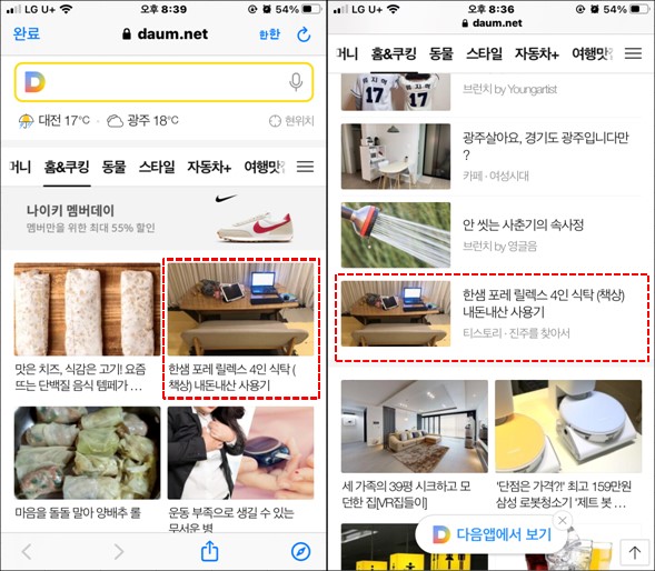 왜 이런 현상이 일어났을까. 아직 구글 에드센스 승인도 받지 못했는데 승인 후에 이렇게 폭증했더라면 더 도움이 되었을 텐데 하며 아쉬움을 달래는 찰나, 다음 메인화면에서 내 글을 발견할 수 있었다. 순간 "와"하는 감탄이 저절로 나오며 아내에게 자랑을 했다. 블로그를 본격적으로 시작한 지 이제 2주 정도 되었는데 메인에 올라갔다니 믿기지가 않았다. 이전에도 방문자가 폭증한 적이 있었으니 그때도 메인에 올라간 게 분명했다. 그리고는 아내와 누나 매형에게 다음 메인화면을 넘기면 내 글이 보일 것이라며 얘기를 해 놓았더니 확인해보고 신기하다며 스크린샷을 보내왔다.