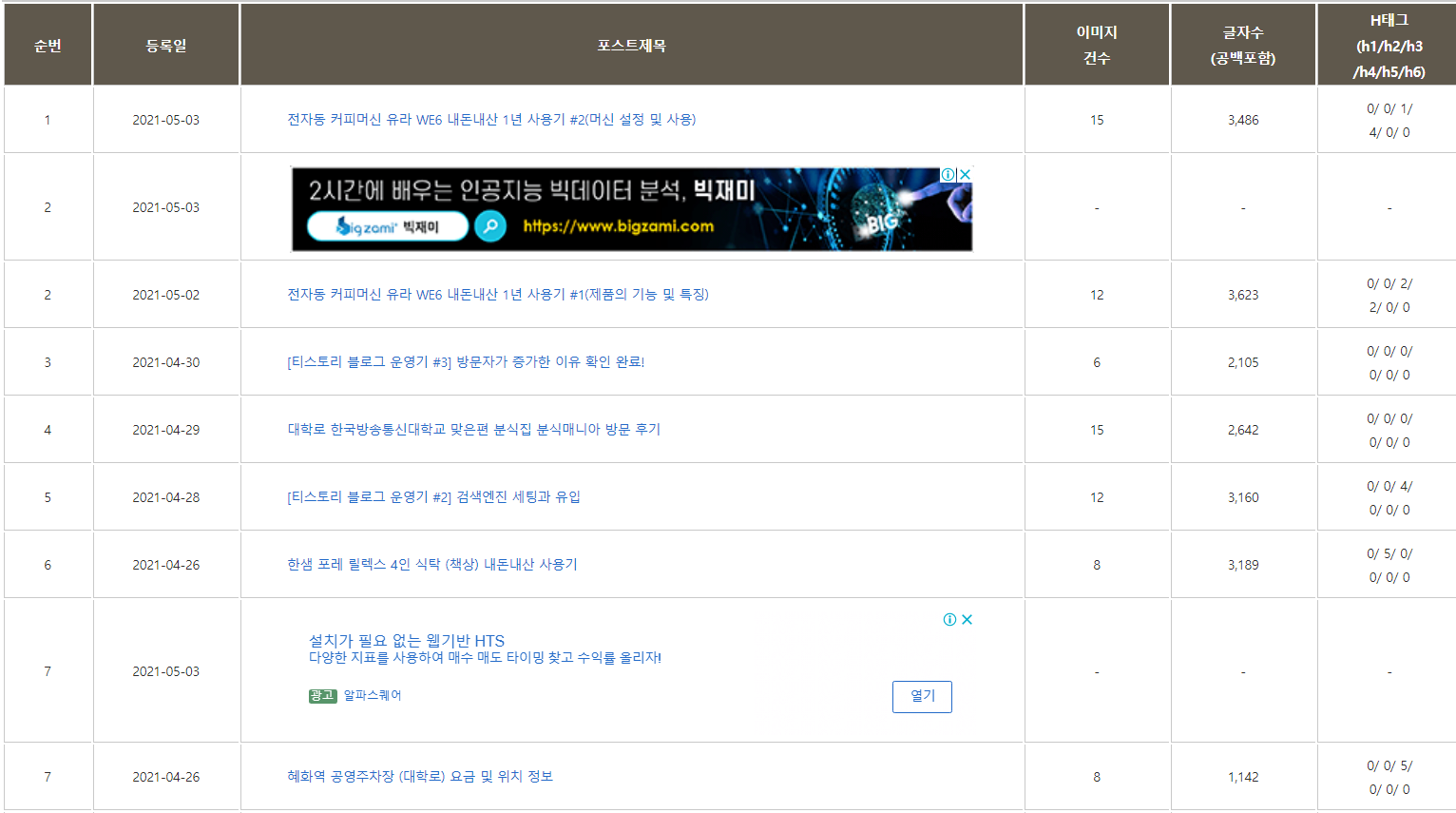 마음 같아선 어떤 포스팅인지 제목을 모두 작성하고 싶지만 내용만 길어질 것 같아 "이미지 삽입 수(동영상 포함), 글자 수" 이렇게만 표시하였다. 자세한 내용이 궁금하다면 직접 들어가서 확인해 보길 바란다.