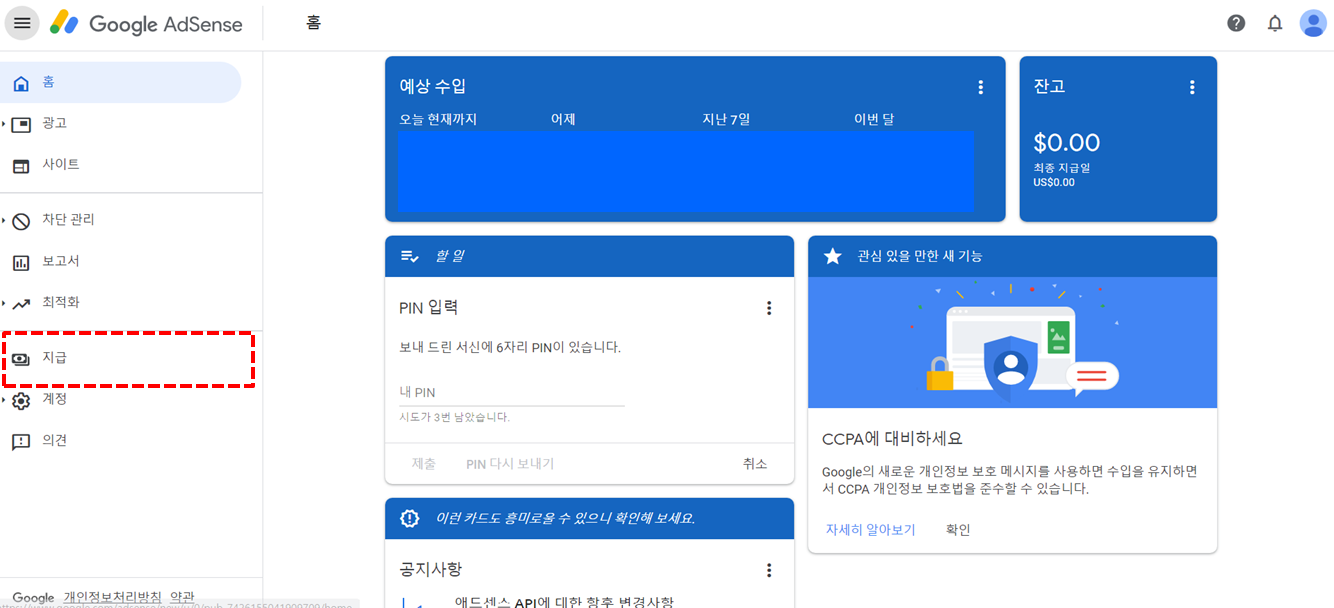 1) 애드센스에 로그인하고 왼쪽 메뉴에서 "지급"으로 들어갑니다.
