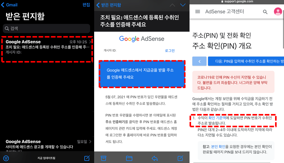 구글 애드센스에서 지급금을 받을 주소를 인증해 주세요. 이 문구가 사람을 얼마나 설레게 하던지 아직 지급받을 시기가 아닌 줄 알면서도 벌써 한 달에 몇 백 만원씩 벌 수 있을 것 같은 생각이 들었습니다. 또 가장 우측 화면에 수익이 확인 기준에 도달하면 PIN번호가 주소로 발송된다고 나와있어 아닌 줄 알면서도 몇 번을 확인했는지 모릅니다. 결국 타 블로그의 도움을 받고 문제를 해결할 수 있었습니다.