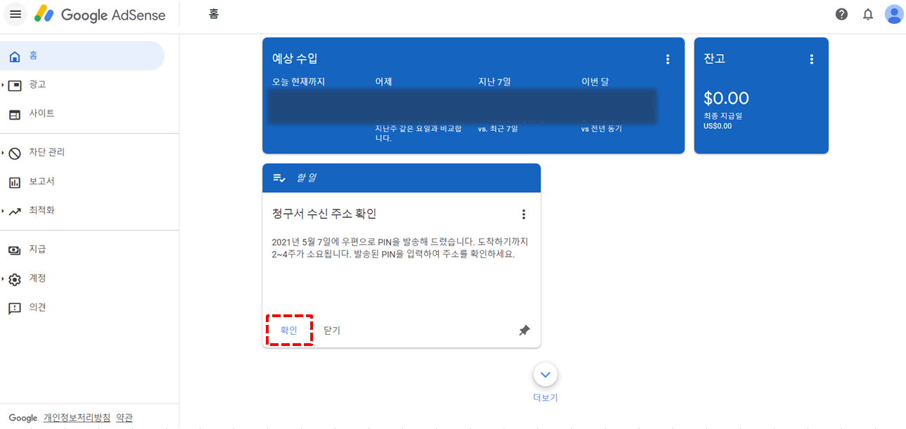 먼저 애드센스 홈페이지에 들어가서 로그인을 하면 아래와 같이 할 일이 나타나 있습니다. 빨간 네모 박스 안에 확인 버튼을 누르면 숫자를 입력할 수 있게 칸이 변경됩니다.