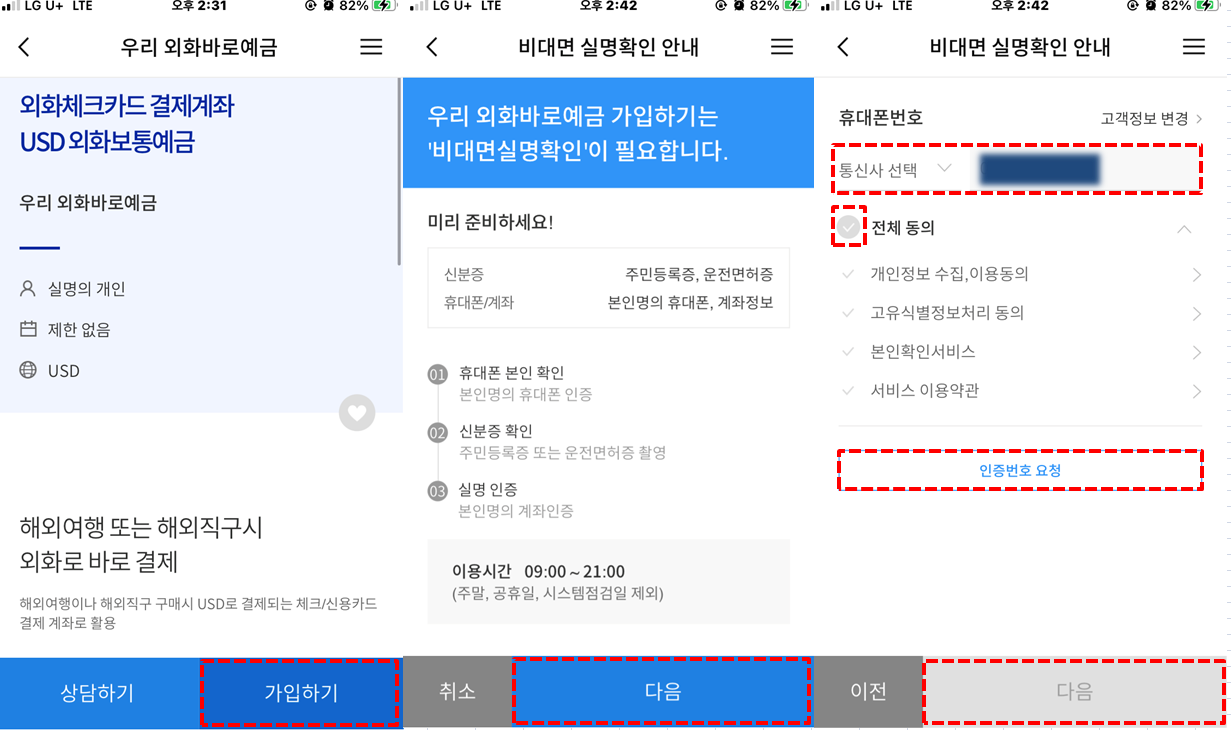 비대면이기에 실명확인 절차가 3단계 있습니다. 통신사 + 신분증(주민등록증, 운전면허증) + 본인 계좌인증으로 되어있습니다. 기존 우리은행 계좌가 있으신 분께서는 신분증과 휴대폰만 소지하시면 쉽게 인증받으실 수 있습니다.
