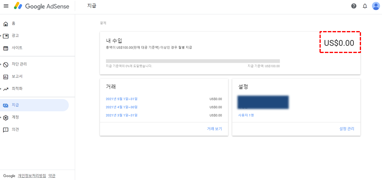 대망의 5월 31일을 기준으로 지급 최소 기준인 100달러를 조금 넘겼습니다. 6월 1일이 되자마자 이번 달 예상수익에 있던 금액이 0.00 달러로 리셋이 되었는데 잔고는 0.00 달러 그대로 있어서 전부가 부정 클릭으로 된 거 아닐까 하는 마음에 엄청 조마조마했습니다. 하지만 역시 애드센스는 기다리는 맛이 있었습니다. 하루 정도 기다리자 예상수익 대부분이 잔고로 넘어왔고 100달러를 넘겨서 지급이 가능합니다.