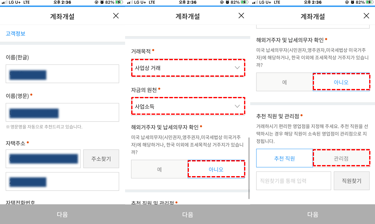 계좌 개설에 대한 목적을 작성해야 합니다. 저는 대한민국 국적을 가진 일반 회사원으로 거래목적과 자금의 원천 등을 선택했고 해외 거주자가 아니기에 아니오를 선택했습니다. 또한 추천 직원은 따로 없어서 관리점을 선택한 후 집에서 가장 가까운 대리점을 선택하였습니다.