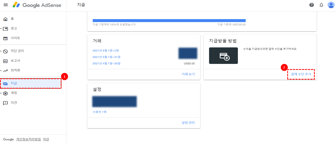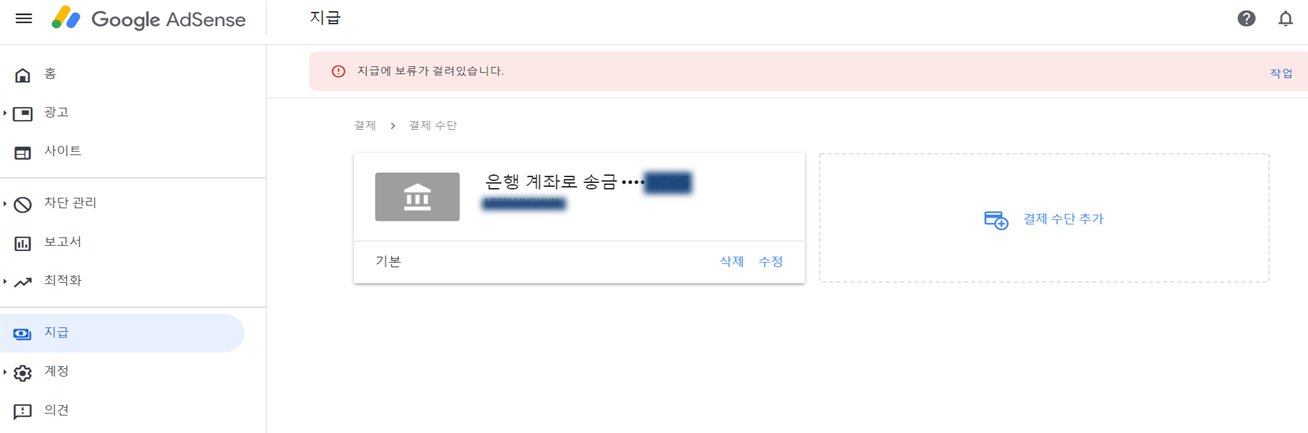 먼저 애드센스 홈페이지에 로그인 후 "지급"에 들어갑니다. 우측에 지급받을 방법이라고 카드가 하나 나오는데 파란 글씨로 되어있는 "결제 수단 추가"를 누릅니다.