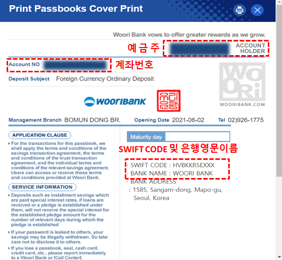 SWIFT CODE: 은행 홈페이지에서 직접 확인하는 것을 추천합니다.
