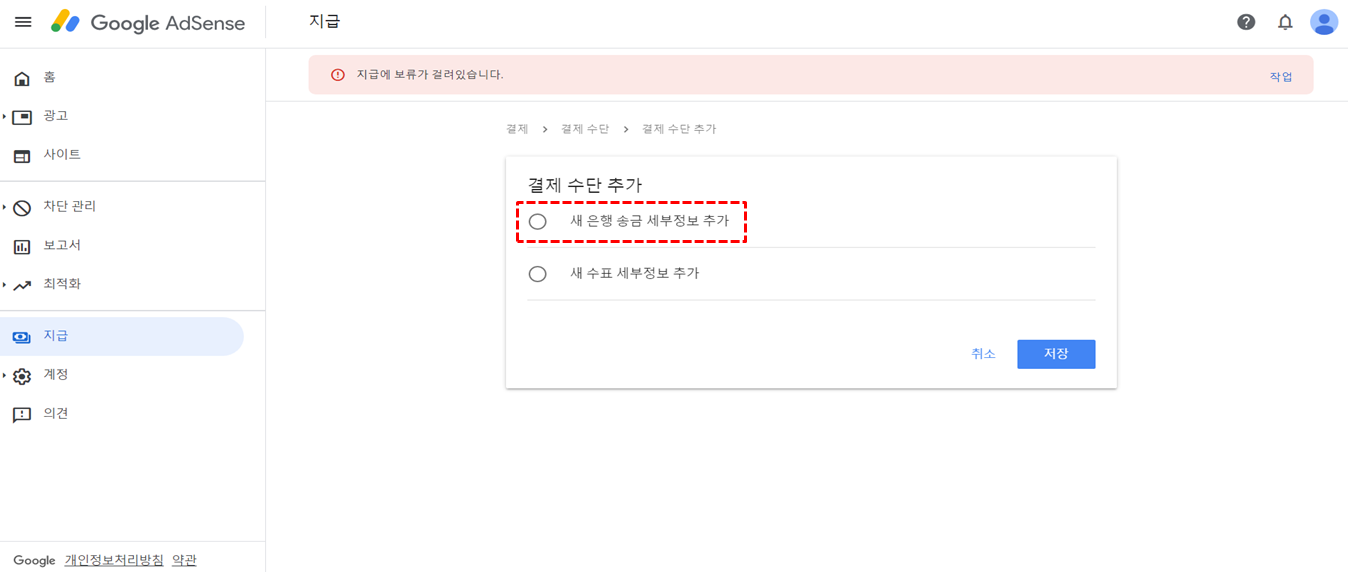 계좌 등록이 안되어있을 경우 상단에 붉은색으로 지급에 보류가 걸려있습니다 라고 명시되는데요. 화면 중간에 새 은행 송금 세부 정보 추가를 선택합니다.