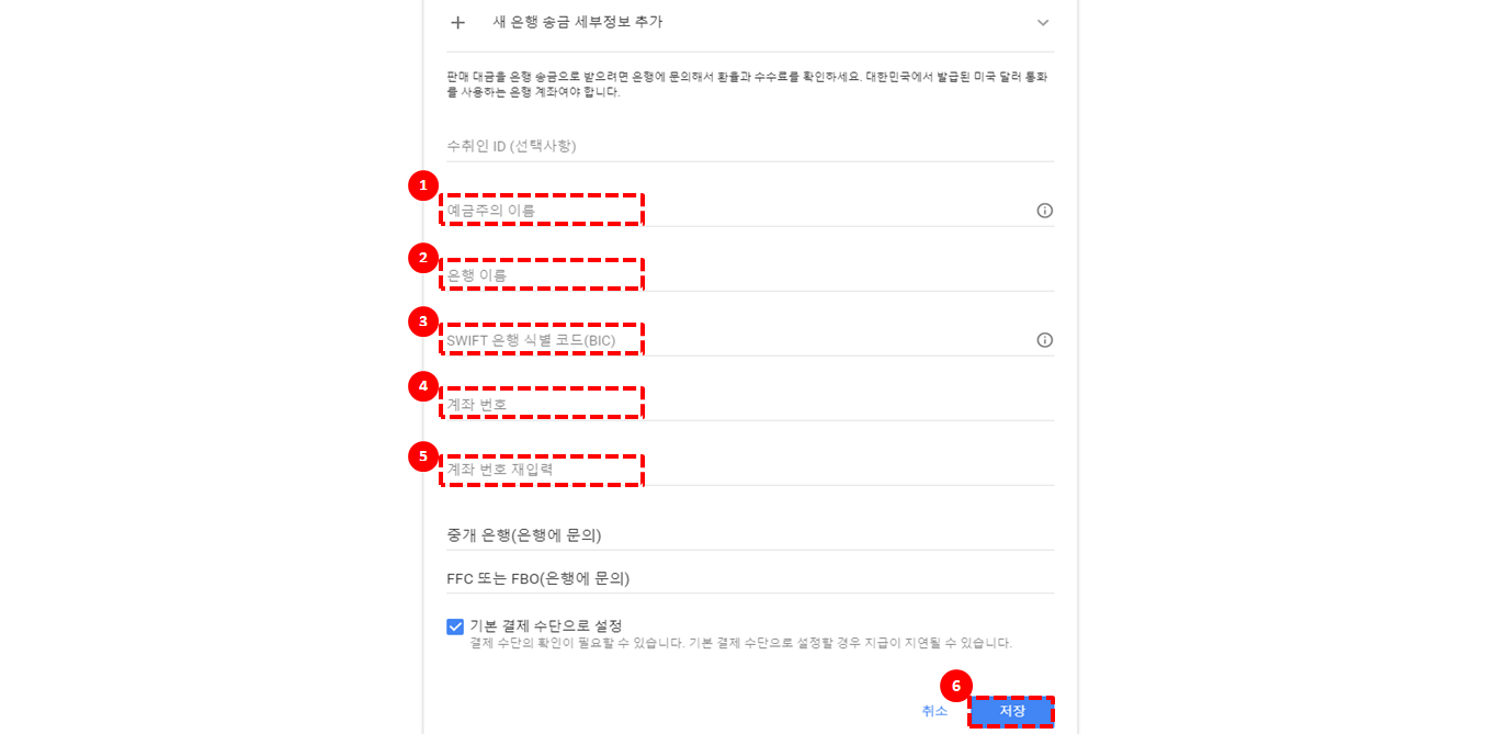 필요정보: 예금주(영문), 계좌번호, SWIFT CODE, 은행명(영문)