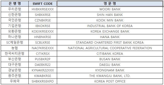이 포스팅에 방문하시는 분들의 편의를 위해서 주요 은행별 영문명 및 SWIFT CODE를 아래와 같이 올려놓았습니다. 필요하신대로 사용하시면 됩니다.
