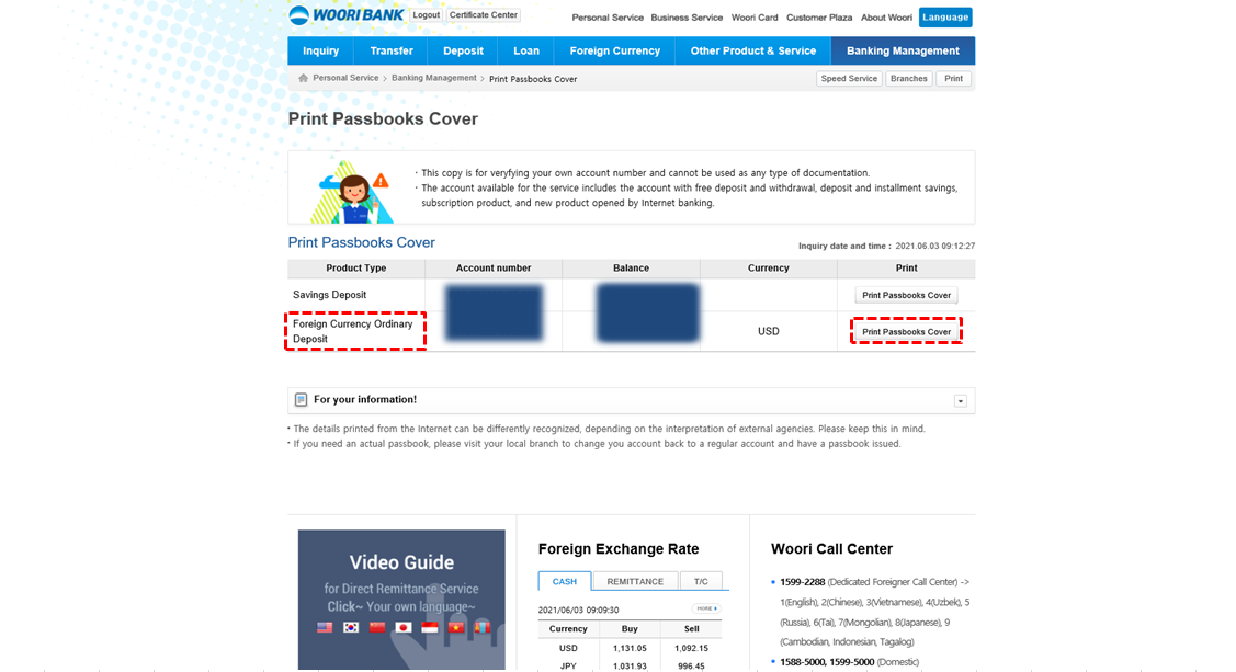 그 후 우측 상단의 Banking Management에서 좌측 하단 Print Passbooks Cover을 누릅니다.