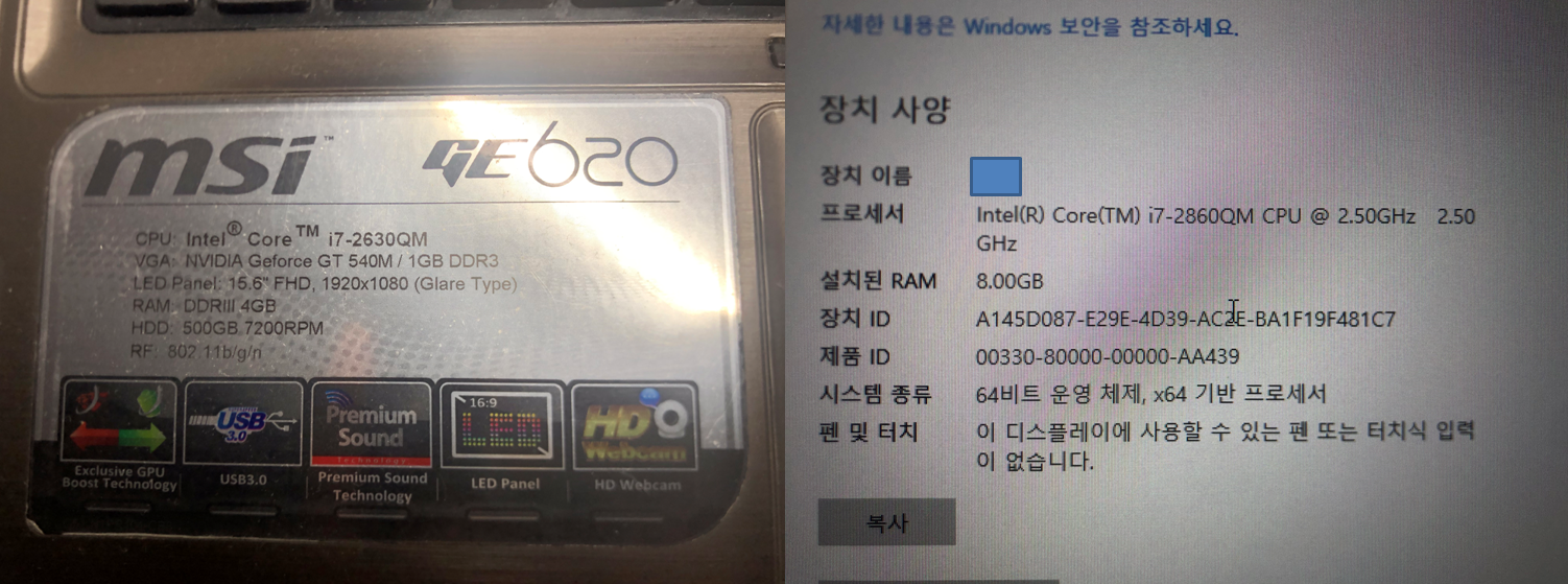 우선 저희 집 노트북의 스펙을 말씀드리면 2011년도에 MSI에서 나온 게이밍 노트북 GE620 모델입니다.