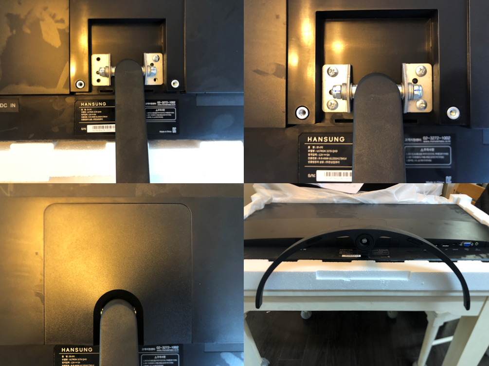 조립은 우선 모니터 뒤편의 케이스를 벗진 후 스탠드 다리를 나사 홀에 맞게 고정한 후 나사로 고정합니다. 조립 나사 중 작은 것 4개를 사용하시면 되고 스탠드 받침대는 조립 나사 중 크기가 큰 1개를 우측 하단의 사진과 같이 설치하면 됩니다.