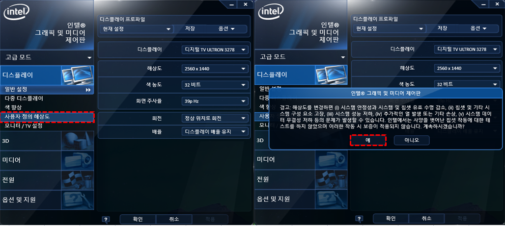 이후 나오는 화면에서 디스플레이에 사용자 정의 해상도를 클릭하고 경고 사항에 예를 눌러줍니다.
