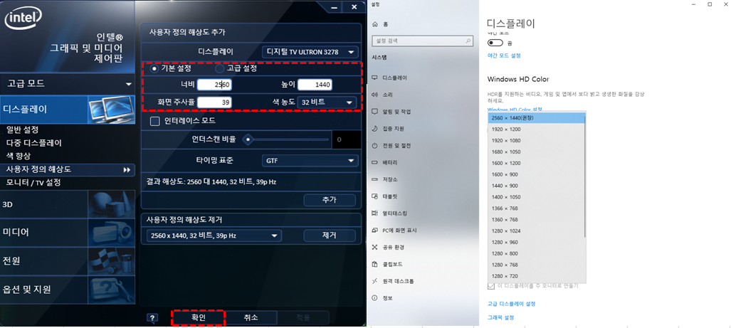그리고 사용자 정의 해상도에서 너비: 2560, 높이 1440, 주사율 39를 입력시키고 확인을 눌러줍니다. 참고로 주사율은 40 이상으로 넣으니 시스템에 문제가 있다면서 적용이 되지 않았습니다. 컴퓨터를 재부팅시키고 디스플레이 설정으로 들어가면 우측 화면처럼 내가 추가한 설정이 표시됩니다. 클릭하여 적용하면 됩니다.