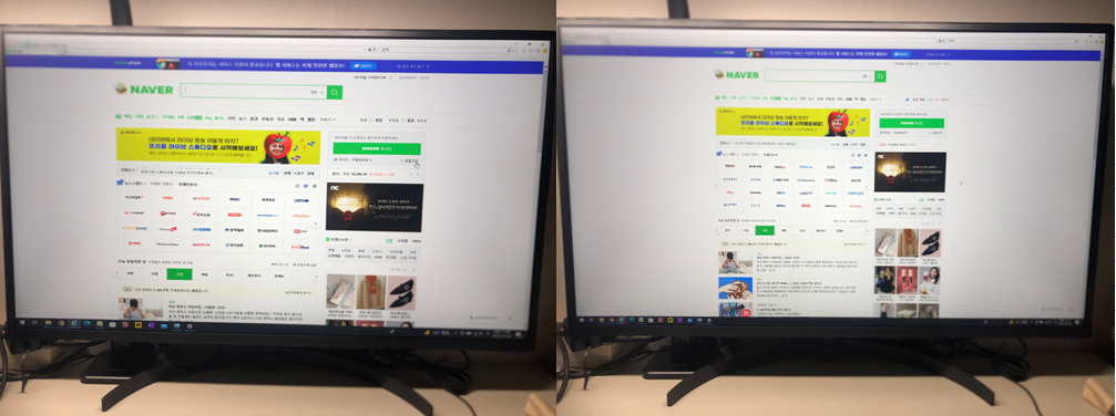 위 두 사진 중 좌측은 연결 후 즉시 FHD 해상도로 표출된 화면이고요. 우측은 QHD에 맞게 해상도를 조절한 모습입니다. 이렇게 사진으로만 보시면 크게 달라진 게 없다고 느끼실 수도 있는데요 실제로 의자에 앉아서 화면을 보면 해상도의 차이가 확연하게 나타납니다. 좌측은 픽셀이 커서 글자가 뭉개지는 느낌이면 우측은 확실히 또렷해집니다.