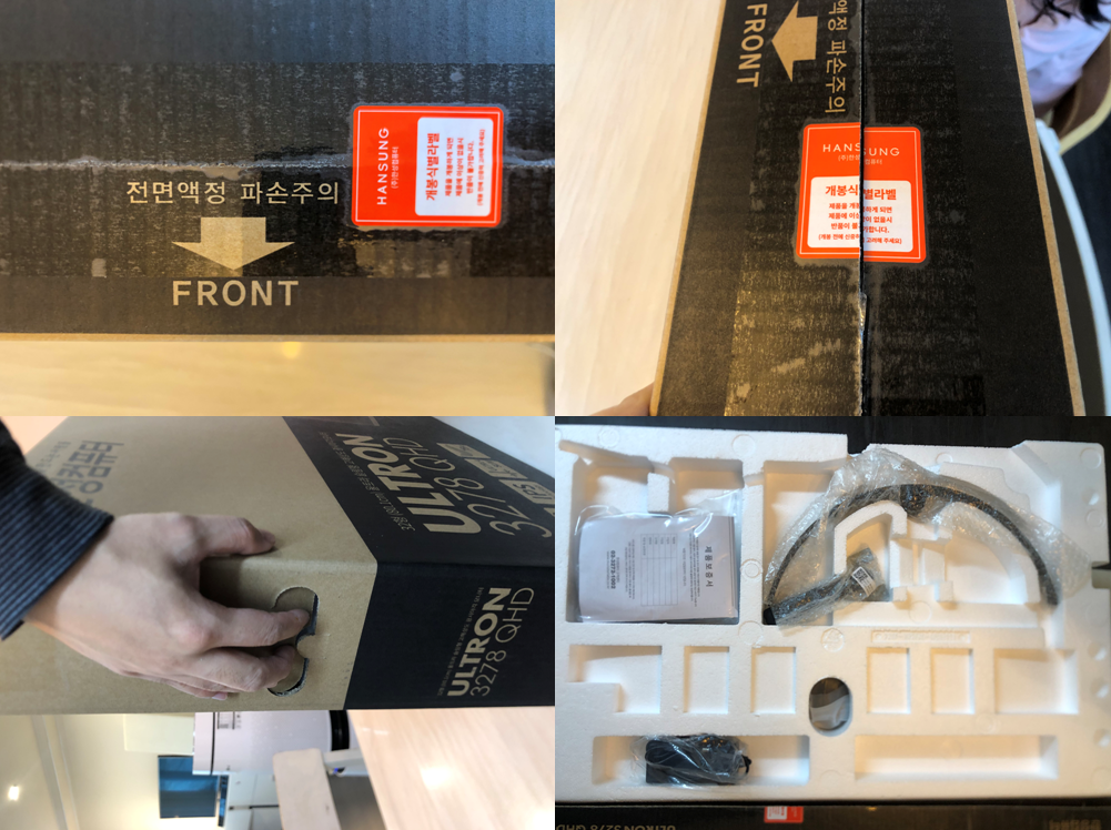포장 상단의 액정 파손 주의 (front) 문구를 확인하시고 개봉 식별 라벨을 제거하신 후 박스를 제거하여 구성품을 확인합니다.