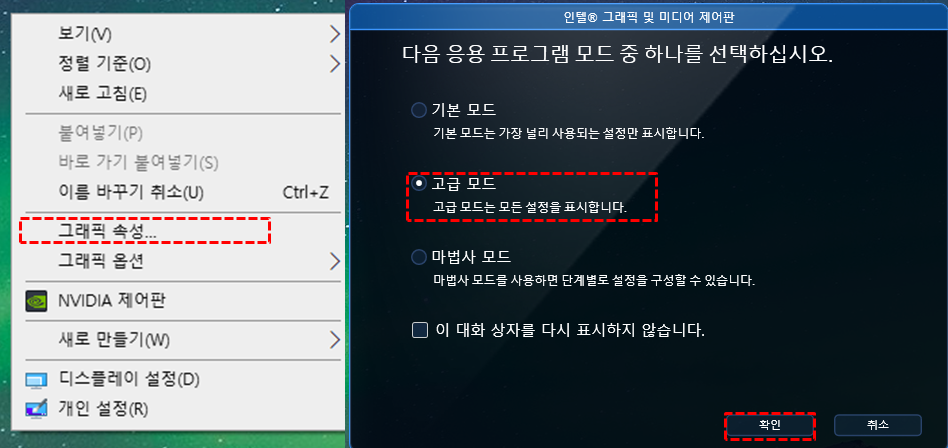 바탕화면에서 마우스 우측 클릭하여 그래픽 속성으로 들어갑니다. 그럼 그래픽 및 미디어 제어판이 나오는데요. 여기서 고급 모드를 선택하시고 확인을 눌러줍니다.