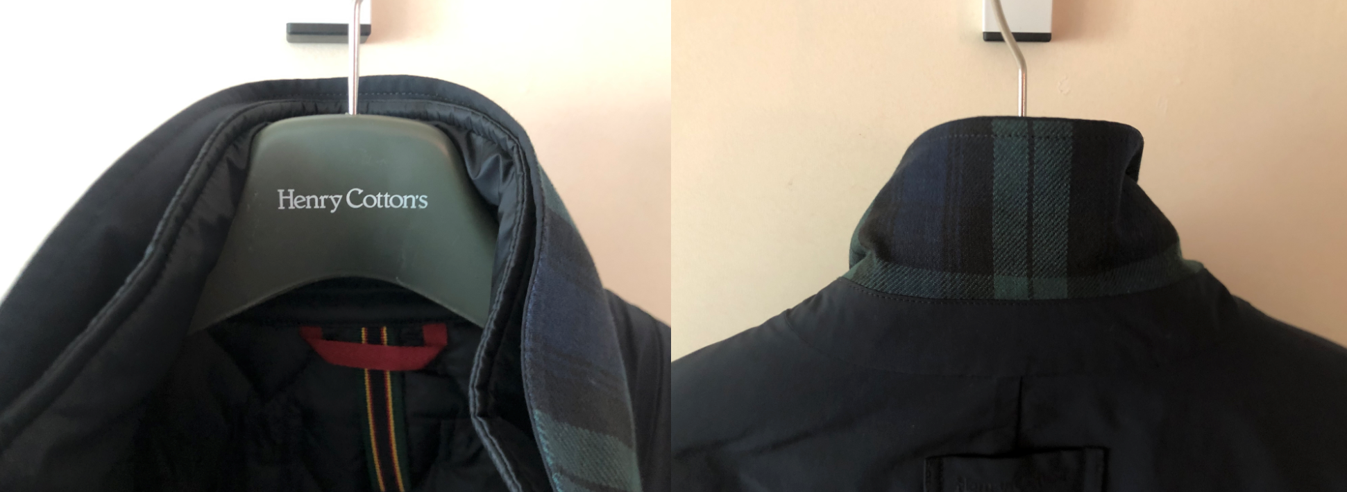 옷의 포인트를 살펴보면 우측 어깨 부분에 three fly fishermen 마크가 달려있고, 뒷부분 등 쪽에는 헨리코튼이라고 글씨가 써져있습니다. 좌측 가슴 쪽에는 주머니가 달려있고 뒤쪽 하단은 가운데 부분이 벌어지는 형태입니다. 그리고 내피와 외피를 결합시키는 단추가 있는데요. 단추 모양과 재질이 상당히 고급스럽습니다.