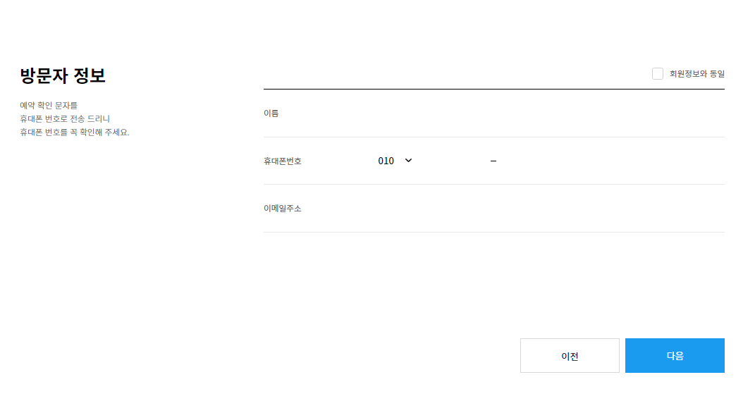 바로 예약을 누르면 금액을 확인 후 정보를 입력하게 됩니다. 예약 확인 문자를 휴대폰 번호로 전동해 주니 입력하시면 편리하게 이용하실 수 있습니다.