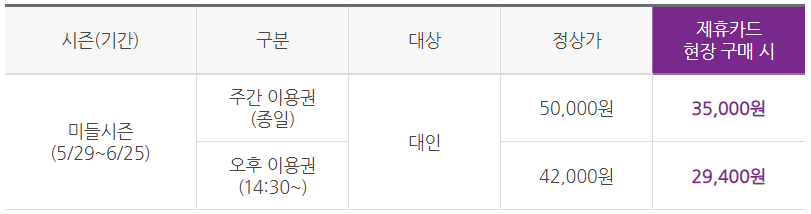 제휴카드가 있는데 현장결재를 하셔야 한다면... 다시 생각해보시길 바랍니다. 하루 전 예약만 해도 종일권을 19,900원으로 구매할 수 있고 동반 3인까지 우대가 가능한데 현장에서 구매한다면 30%밖에 할인이 적용되지 않아 35,000원을 내셔야 합니다. 동반인 우대가 없어 1인당 무조건 35,000원을 결재해야 합니다.
