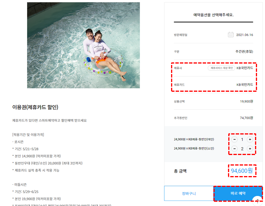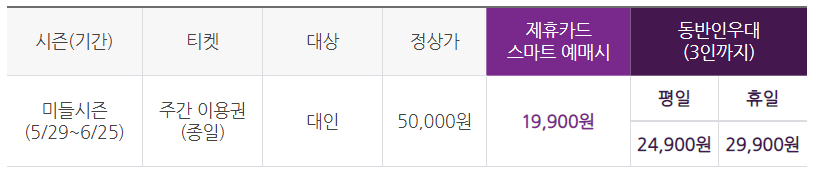 이번 미들 시즌에서 가장 추천하고 싶은 할인이 KB 국민카드 할인입니다. 그 이유는 금액을 확인해 보시면 바로 알 수가 있습니다. 본인도 약 만원에 이용이 가능한테 동반인 3인까지 20,000원으로 우대 혜택이 제공됩니다. 단, 체크 및 기업카드, KB 비씨나 선불카드는 제외이니 참고하십시오.